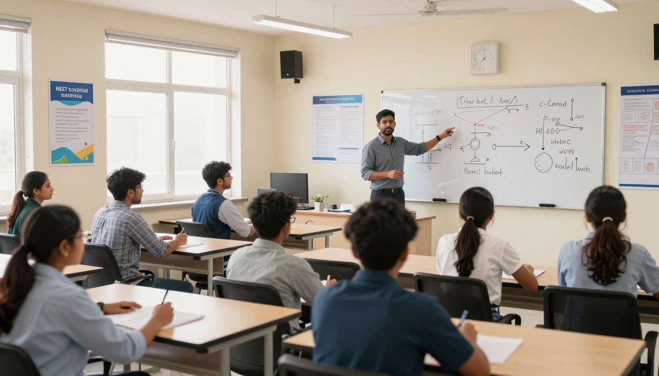 NEET coaching classroom in Dehradun with students studying medical entrance preparation